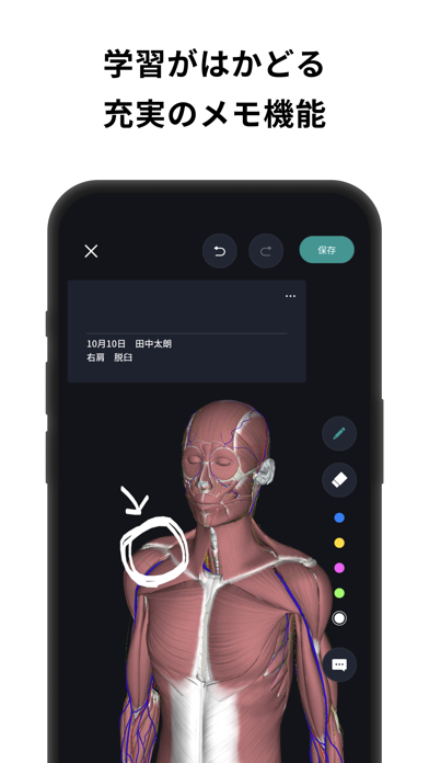 - 部位をタップすると解説が表示される。メモに残せる機能もあり