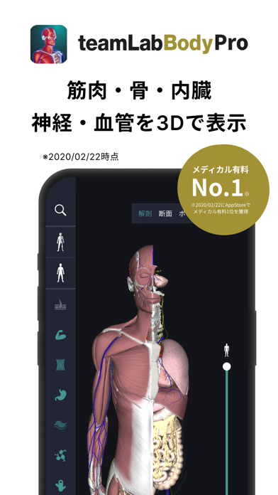解剖学の学習、医療現場での患者さんへの説明や国家試験対策の勉強などにご活用頂けるほか、またスポーツやフィットネスに取り組んでいて、体の仕組みに興味がある方でも直感的に人体の仕組みが学べます。