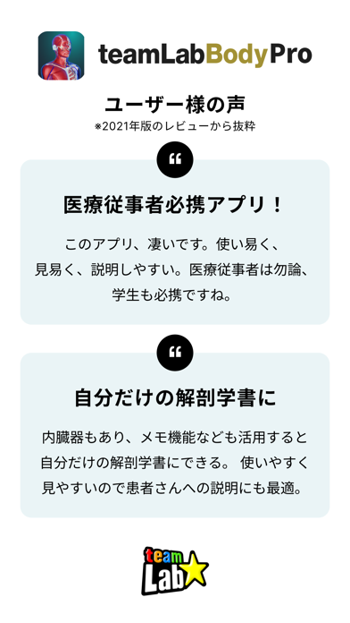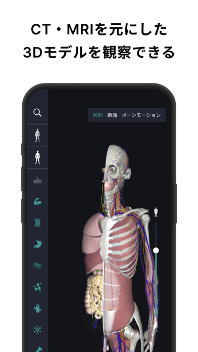 解剖学の学習、医療現場での患者さんへの説明や国家試験対策の勉強などにご活用頂けるほか、またスポーツやフィットネスに取り組んでいて、体の仕組みに興味がある方でも直感的に人体の仕組みが学べます。