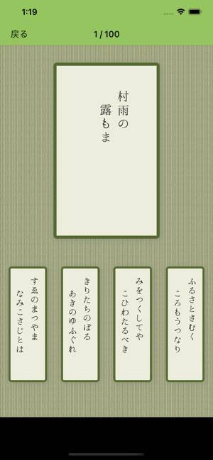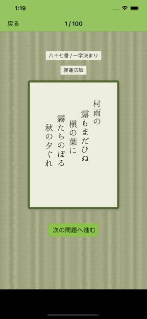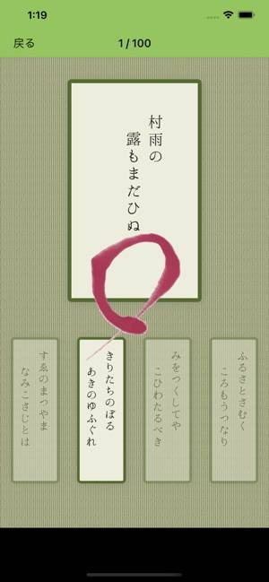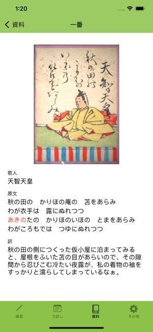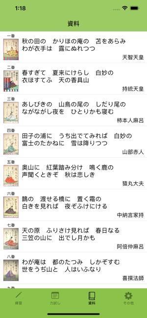 百人一首は何とも奥が深いですが、まず歌を全部覚えなければ始まりません。本アプリは、百人一首を覚えるための暗記ツールです。上の句を見て下の句を4択から選ぶシンプルな仕組み。1文字から6文字の決まり字を指定した練習方法もあり、各歌を完璧に覚えられるため、競技かるたにも対応しています。