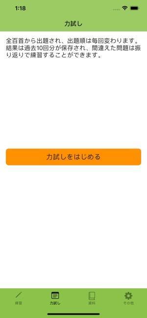 最終的に全百首がランダムに出題される力試しモードで学習成果を確認できます。これまで覚えた歌が次々と出題。力試しモードに10回挑戦することで、過去のデータが蓄積され、苦手な歌のみを反復練習できるようになります。