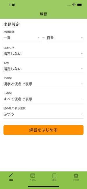 決まり文字の指定が可能なため、上の句の最初の文字から瞬時に下の句を導き出せるようになります。1文字ずつ表示される演出も読み上げに近い雰囲気で、本格的な学習が可能。読む速度の設定も4段階で行えるため、初心者から上級者まで使いやすいです。