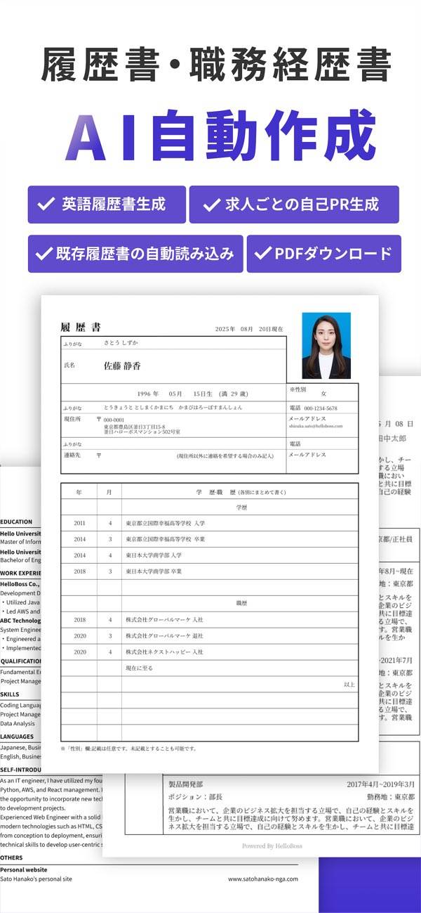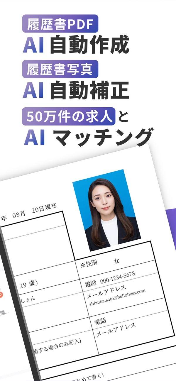 AIが企業の採用担当者に直接繋げてくれます。履歴書を作成するだけで、記載内容に合った企業を紹介してくれるため、効率的だと感じました。気になった企業があれば、気軽に「Hello Boss」と挨拶してチャット可能。採用担当者とやり取りできるので、スムーズに進められました。