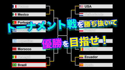 ボタンで選手を操作するだけでサッカーを楽しめるアプリ。スローインやゴールキックは自動で行われるため、難しい操作は一切ありません。強豪国32チームから選べて、ヨーロッパや南米の国が多く収録されています。優勝目指してチャレンジしてみてください。
