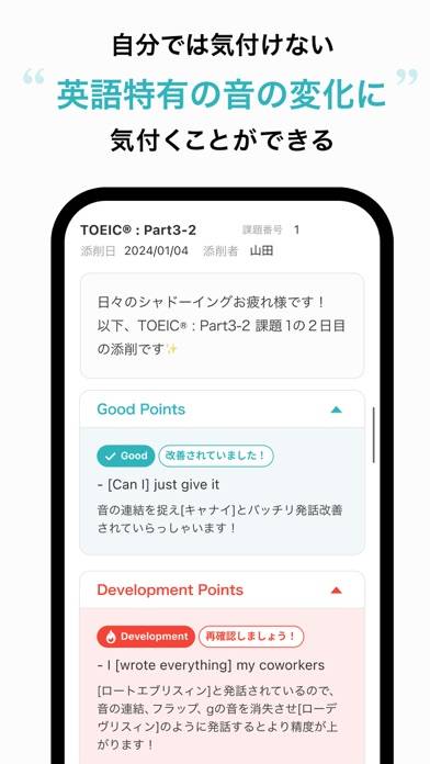 一人でシャドーイングをしても、上達しているかわからず悩んでいました。発音が正しいかどうかは、プロに聞いてもらうしかないので。ですが、このアプリの添削で、良い箇所と直すべき箇所が明確になりモチベーションも向上しました。提出してから24時間以内にはFBが来る印象です。