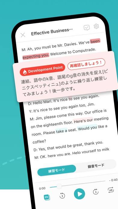 通勤やスキマ時間にスマホでシャドーイングができる、リスニング重視の英語学習アプリです。録音した音声にプロの添削がついて、発音や抑揚まで手厚くサポート。着実に耳を鍛えて、ビジネスの会話にもついていける英語力が身につきます。