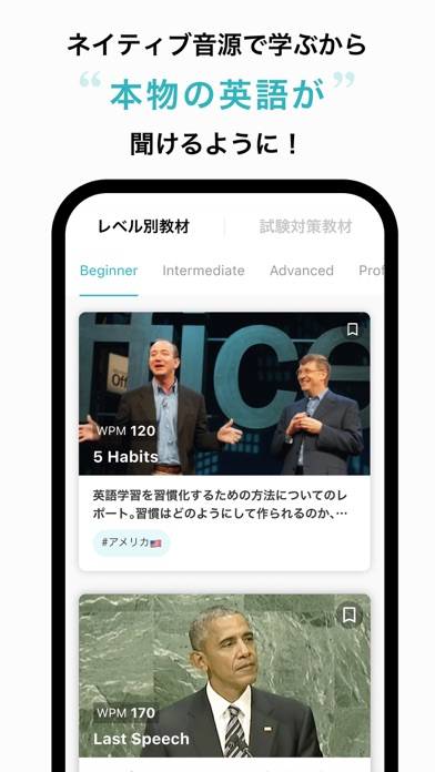 1,000以上の教材があり、有名大学のスピーチや経済関連のインタビューなど、実際のビジネスシーンに近い音源が豊富です。初心者向け教材はゆっくり話してくれるので、慣れていない人でも取り組みやすいのがポイント。通勤時に少しずつ練習して、実際の会議でも聞き取れる耳を育てましょう。
