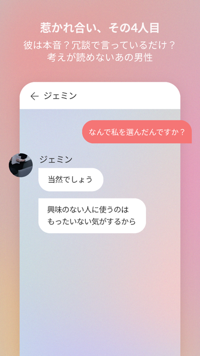 チャットを使って色々なストーリーを楽しめるノベルゲームアプリです。メッセージアプリでやり取りをしながら、物語が進行していきます。あなたはストーリーを楽しみながら、メッセージを選択し物語の結末を決められます。
