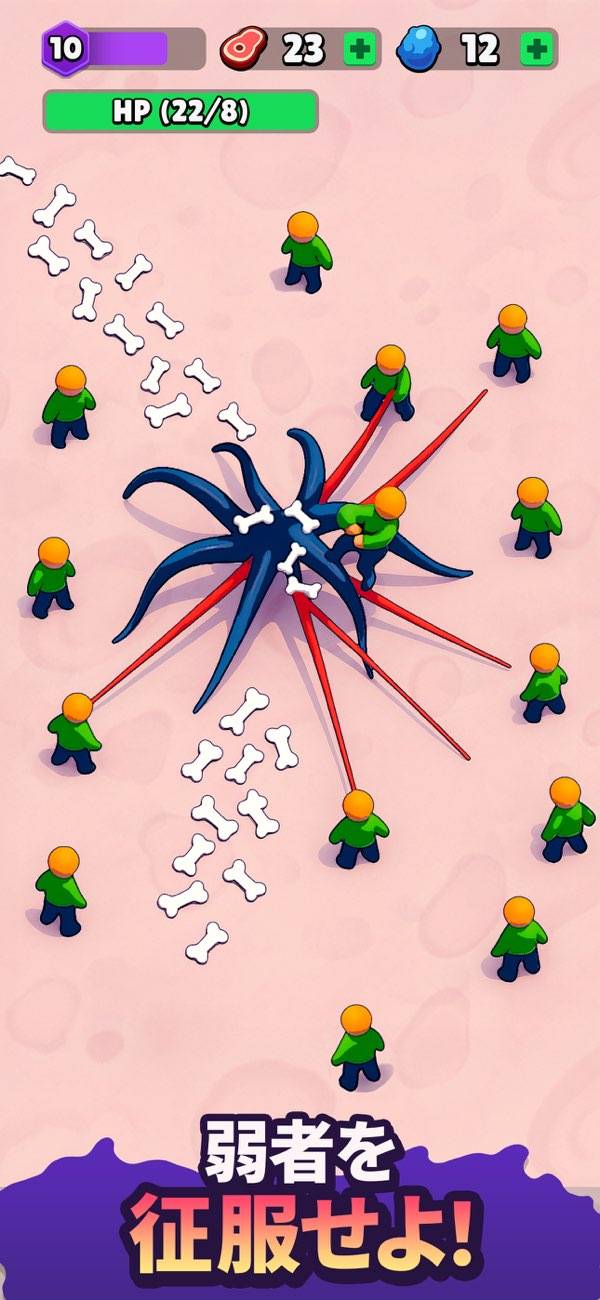 エイリアンを操作して、エサ(人間)を食べていきましょう。ロックした人間のパーセンテージがゼロになると肉を確保できます。操作は基本画面を長押ししたり、タップしたりするだけなので手軽に遊べますよ。