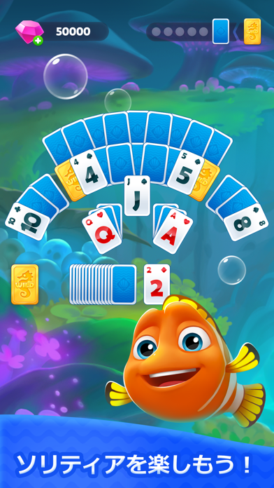 アクアリウムとソリティアが融合した、熱帯魚好きにはたまらないゲーム。ソリティアのお題をクリアして、ステージを進めていくのが本作の基本です。ところが、本作にはアクアリウム要素があります。魚や装飾アイテムはクリア報酬などでもらえるコインで購入可能。大好きな魚のためにソリティアをがんばることになるかも……!?