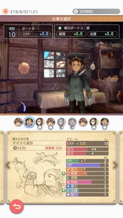 魔物退治や町の雑用などを行うと、対応したステータスが上がります。またお金ももらえるので、冒険の支度を整えましょう。クエストには曜日によってボーナス倍率が変わります。倍率が高いものを選ぶと、効率的に育成可能。