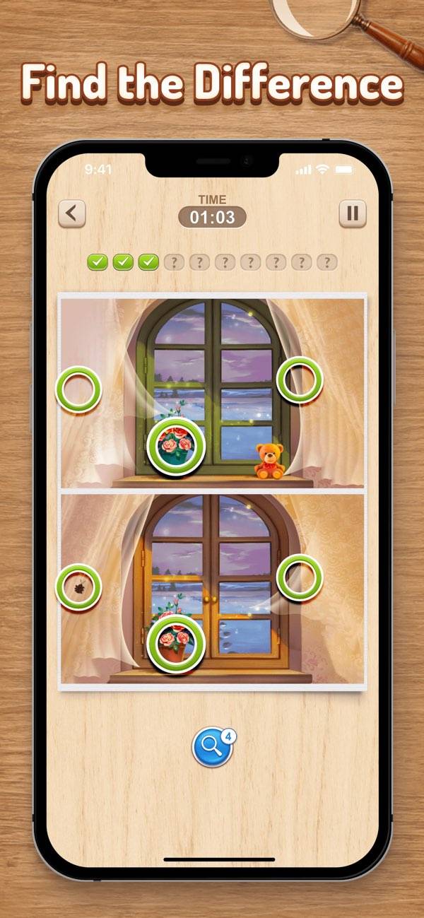 2つの絵のなかから間違っている場所を見つけて、タップしていきます。間違いの数は全部で10ヶ所。どうしてもわからない場合は、虫眼鏡マークをタップすることでヒントがもらえます。