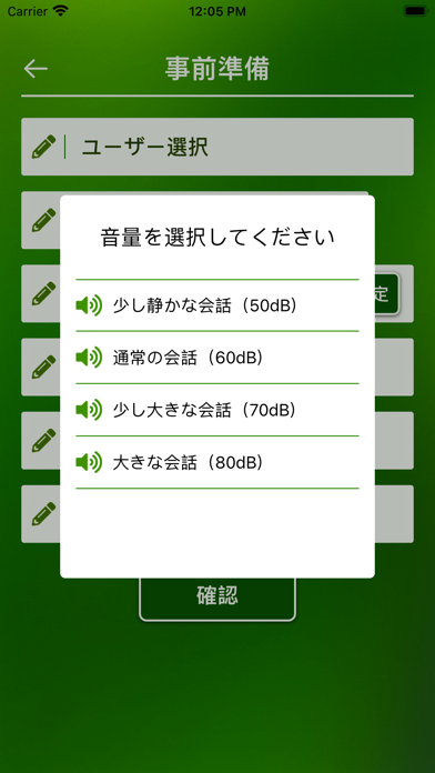チェックでは、聞こえた音声をひらがなで入力していきます。音量は「静かな会話」「大きな会話」など4種類の中から選べます。まわりの騒音レベルも検出してくれ、ちょうどいい音量でチェックができます。