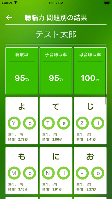 テストが終わると、ただちに結果が点数で表示。また、音声一つひとつについて、何回聞き返したか、母音と子音のどちらが正解だったかなどがわかります。これらの機能により自分の聴覚の特性をすぐに理解できます。