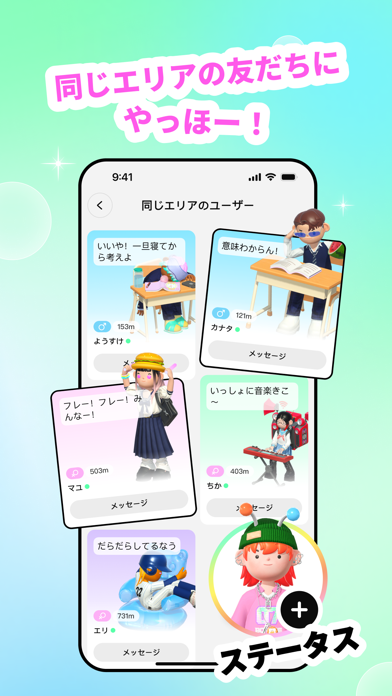 自分の現状をアバターの動きで伝える「ステータス」や、短い文を投稿するSNS機能があります。「ステータス」は「仕事中」「いぬの散歩」「ひゃっほー!」など項目が多数。そのときの状況や気分に当てはまるものを選択すると、3Dアバターがさまざまなポーズや動きで表現してくれます。