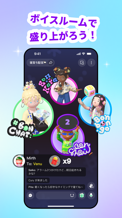 また参加者と10問の質問に答える遊び「BonShow」や、歌うま度でスコアが決まる「BonKara」など会話以外のコンテンツも用意されています。遊びの流れに乗れば、知らない人との距離も縮まるでしょう。