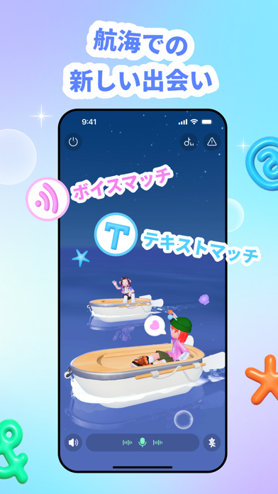 知らない相手と出会いたいときは、「航海」でランダムチャット・通話。最初は相手と自分のプロフィールを見ずに会話が始まります。話してみて「いいな」と思い、お互いに情報を公開すると制限時間がなくなる仕組みです。気が合う人とだけ長く話せるつくりで、無理なく誰かと出会えます。