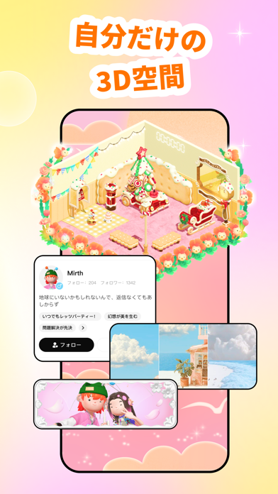 アバターを作って、見た目や雰囲気を自分好みに整えながら交流。服や小物だけでなく、部屋の模様替えもあり、見せ方に遊び心を入れやすいのがポイントです。顔出しの必要がなく、かわいい3Dアバターで自分を表現すれば知らない人との交流がしやすいです。