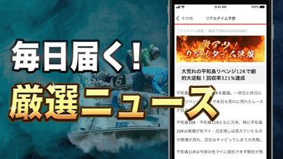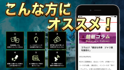 レース情報と的中率にこだわった競艇予想アプリです。競艇予想における見解が見られるので、情報をもとに自分で判断したい人にもぴったり。1レースの資金は1,000円から始められます。ボートレースの予想情報だけでなく、古いコラムも掲載されています