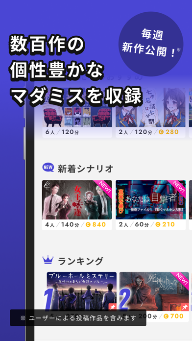有名作品やオリジナル作品など、120以上のシナリオが収録されています。人数や所要時間はもちろんストーリーも幅広く、飽きずにいろいろなゲーム展開を楽しめるでしょう。シナリオは今後も続々と追加予定です。