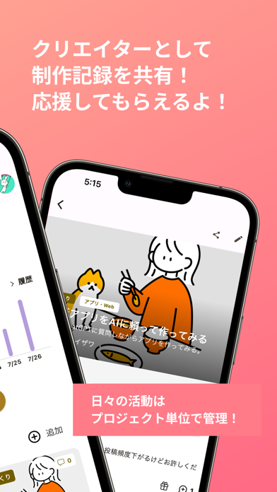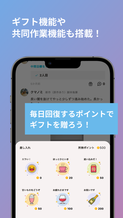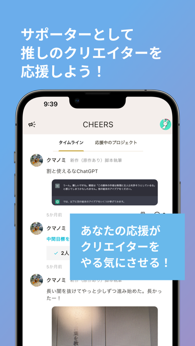 創作の旅は孤独ですが、志を共にする仲間と出会えます。プロジェクト管理機能で進捗を整理し、応援メッセージでモチベーションをアップ。目標達成ログで毎日の成長を実感できます。応援する側にもなることができ、同じ目標を持つ仲間と支え合えます。