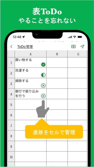 本アプリのおすすめの使い方はタスク管理。セル内にタスク用のアイコンを表示でき、ひと目で進捗度がわかります。ちなみに再生マークは進捗度0%、半分黒塗りは進捗度50%、チェックはタスク完了の目印。アイコンをタップするだけで進捗度を変更可能です。