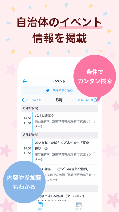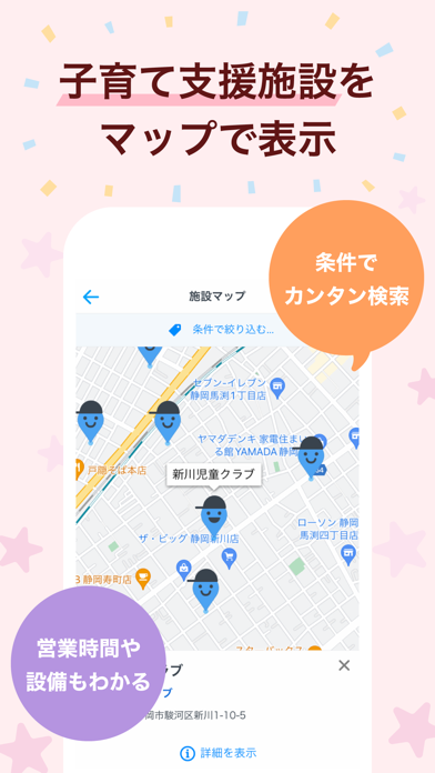 - 気軽に行ける子育て支援施設や、イベント情報をアプリでチェック