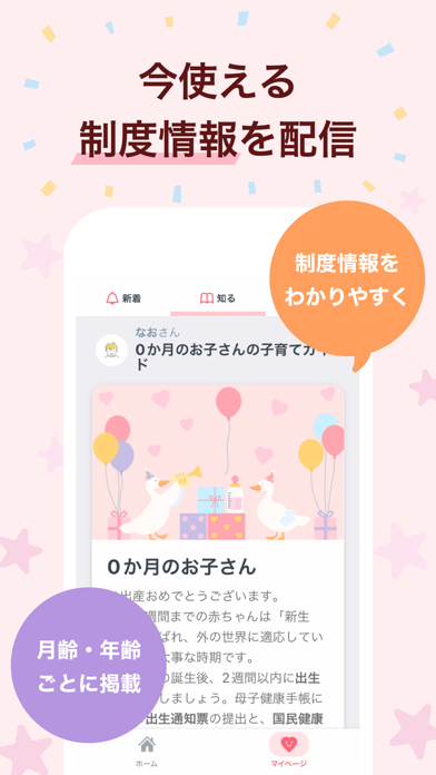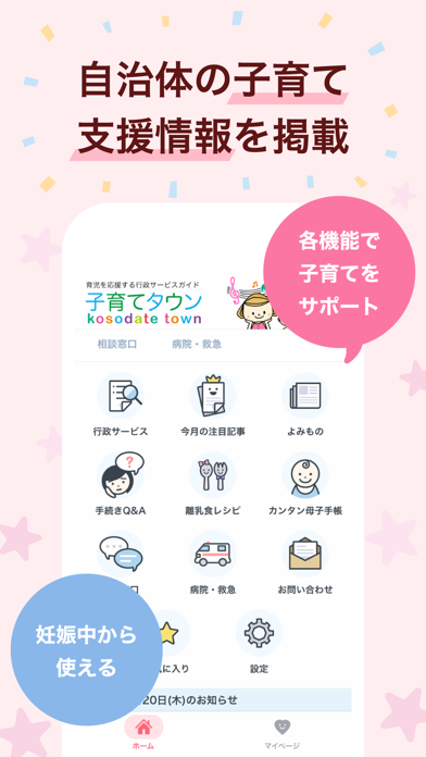 自治体からの重要な情報がプッシュ通知で届きます。地域で開催される子育て関連のイベントを、素早くチェック可能。また子供のマイナンバーカードの申請方法や、イライラする気持ちへの対処法など、子育てに役立つコラムが盛りだくさんです。