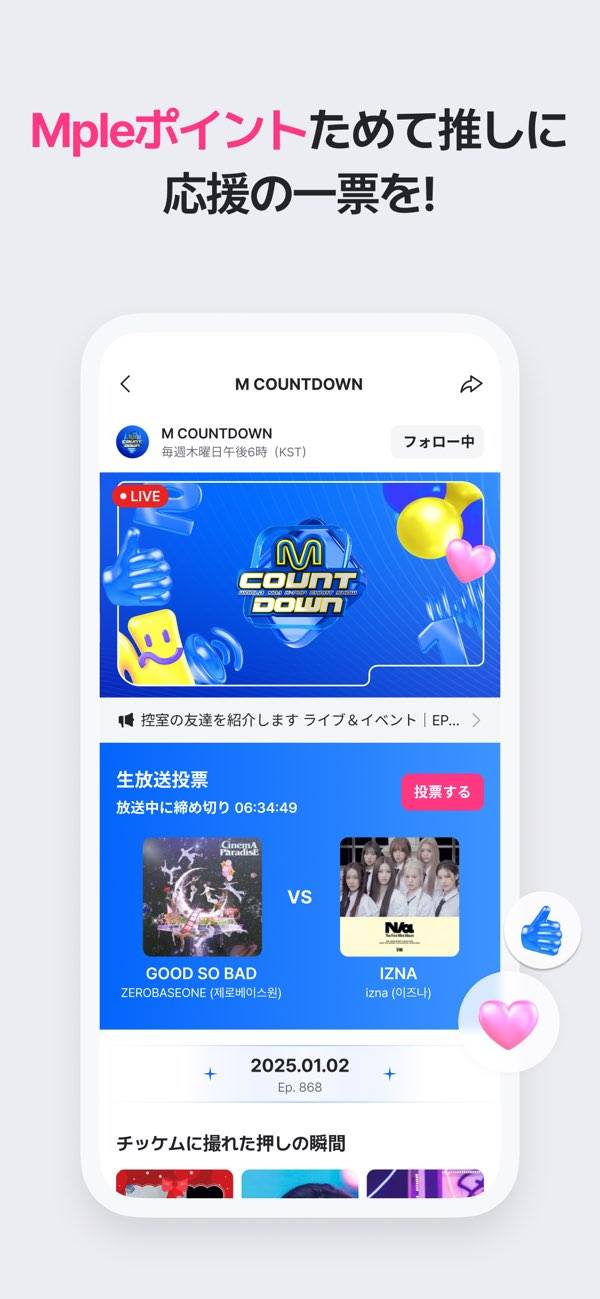 韓国の音楽番組やドラマなどのエンタメを楽しめるアプリです。またアプリ内で定期的に開催される投票プラグラムに参加して、推しを応援できます。