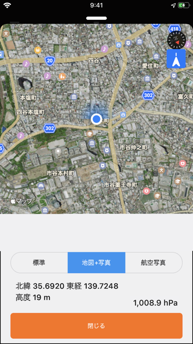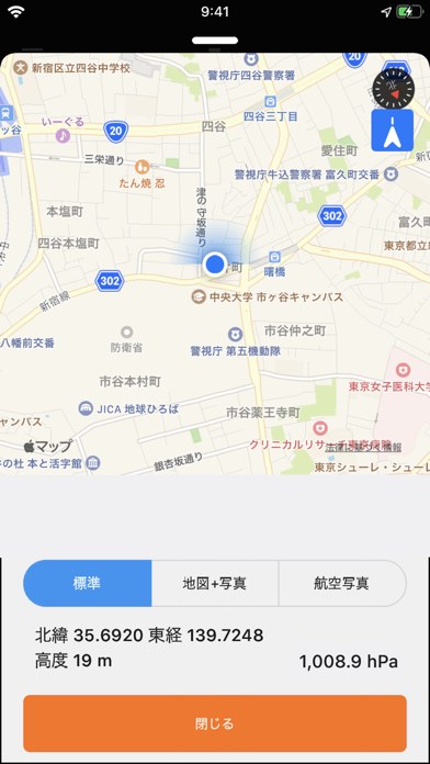 アプリ内に地図機能も搭載しています。現在地の緯度経度も表示され、現在地を伝えるのに便利です。さらに航空写真も対応しており建物などの見た目を確認できます。地図と航空写真を合体することもでき、建物を確認しながら目的地に向かいやすいです。