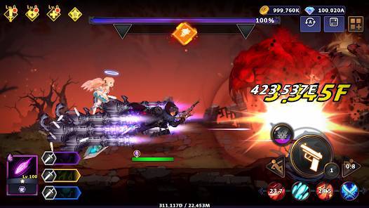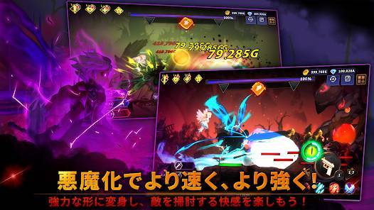 本作には「悪魔化」という独自要素があります。悪魔化すると堕天使のような見た目に変身して、攻撃力・攻撃速度・移動速度が一時的にアップ。また悪魔には属性ごとに形状があり、敵の有利属性の悪魔に変身して挑むことになります。