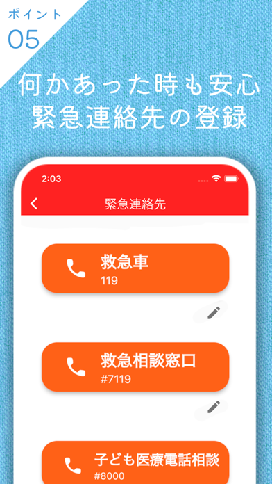 - 緊急連絡先を個別に登録可能。ワンタップで迅速に通報できる