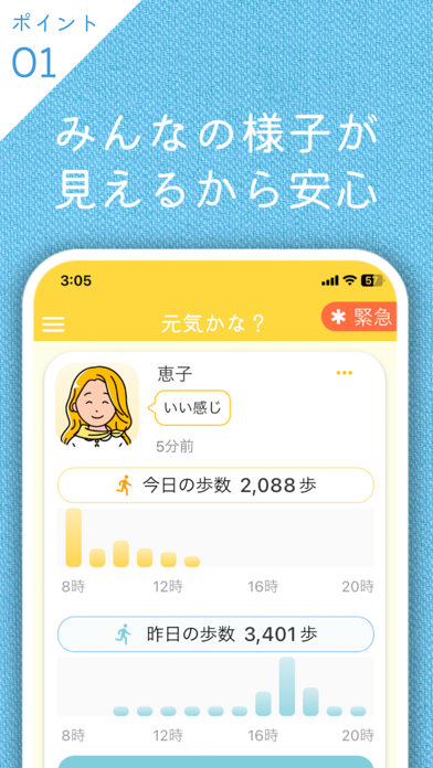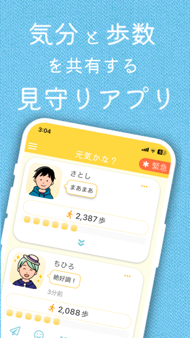 登録ユーザーが、お互いに見守り合うことを目的としたアプリです。現在の気分と歩数を共有することで、お互いが元気に過ごしているかどうかがわかります。
