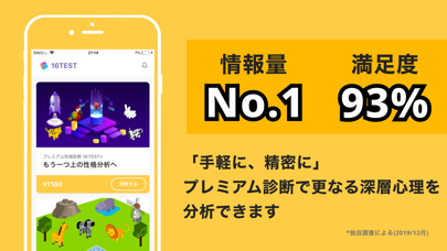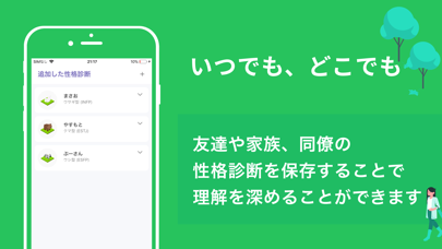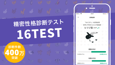 「ヒツジ」「ライオン」など16種類の動物タイプで、性格がわかります。4つのグラフと1つのチャートによる詳細な診断結果を表示。診断テストとして楽しみたい人はもちろん、就職・転職や恋愛など幅広い使い方が可能です。