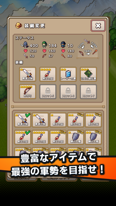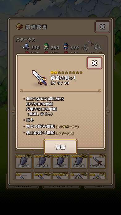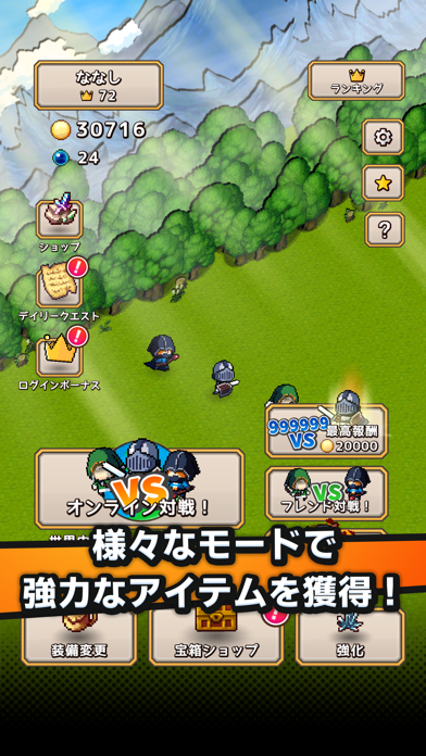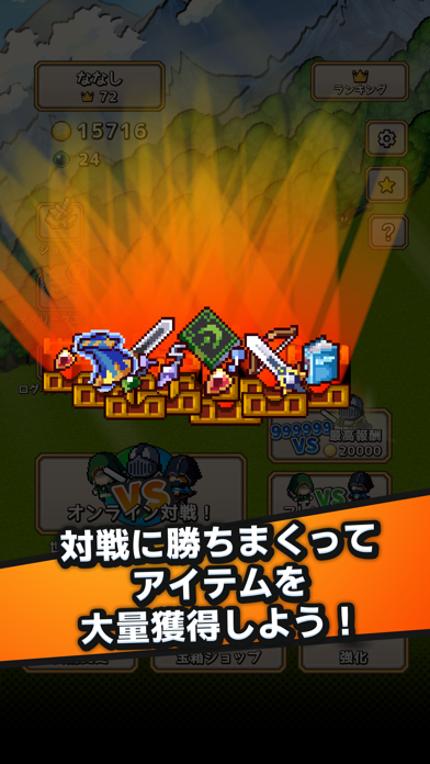 獲得したコインは勇者の能力強化や装備獲得に使います。バトルではランクが近い相手が選ばれるため、強化や装備の有無がバトルに大きな影響を与えます。たくさん戦ってコインを集め、勇者の育成に力を注いでみましょう。