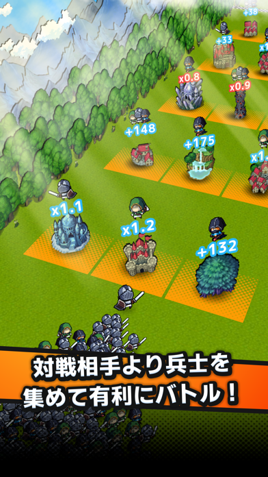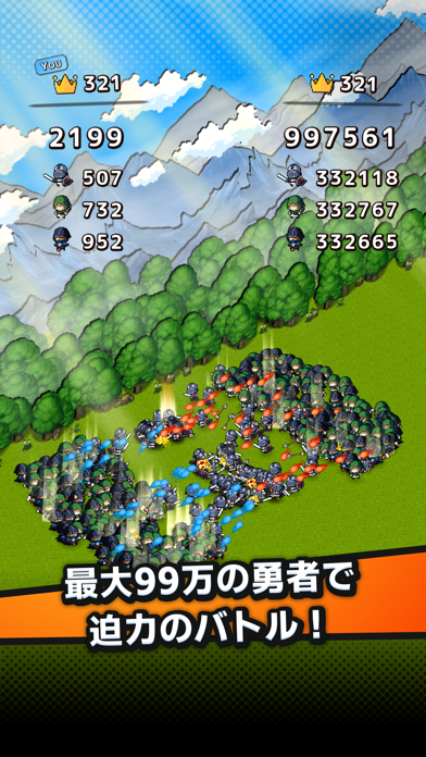 勇者同士がぶつかり合うオンライン対戦型のカジュアルゲーム。1試合あたり2分程度で、左右にスライドするだけの簡単操作で遊べます。勇者のジョブは複数ありそれぞれに得意不得意があるため、闇雲に仲間を集めるだけでは勝てないのが面白いところです。