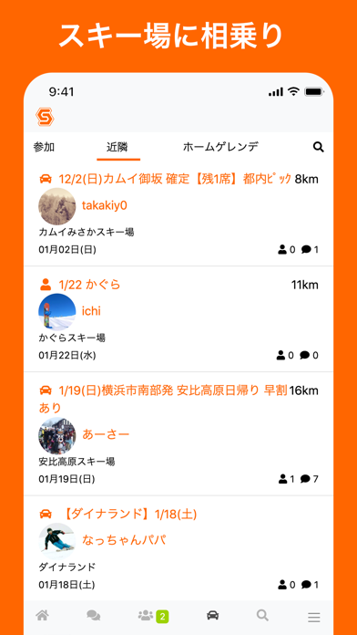 同じゲレンデに行く人を見つけて、相乗りに誘えます。乗せる場合も乗る場合も、いつ・どこから・どこに行くかを投稿するだけ。あとはコメントが来るのを待っていれば、一緒に滑りに行ける人がコメントをくれます。