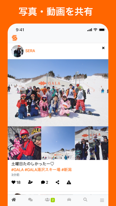 写真・動画を投稿して、スキー・スノボ好きとのやりとりが楽しめます。気になった投稿があれば、いいねやコメントでやり取りしてみましょう。仲良くなれば、メッセージでのコミュニケーションも可能です。また検索機能を使えば、効率的に仲間を探せます。
