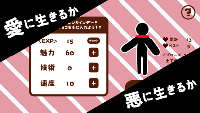 3つのステータスにEXPを割り振りプレイヤーを強化する育成要素も。純粋にアタックしたい人は、魅力を育ててアプローチ・土下座の成功率を上げるのがおすすめ。逆に、技術を育てて強奪の成功率を上げれば、華麗にチョコをかっさらう怪盗にもなれます。