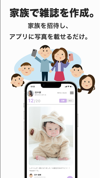 アプリに載せた写真から、毎月自動で雑誌を作成可能です。雑誌の表紙と記事の中身は、アカウント内のメンバーであれば自由にカスタマイズできます。誕生日や七五三など、かけがえのない家族の写真を集めて共有してみませんか。