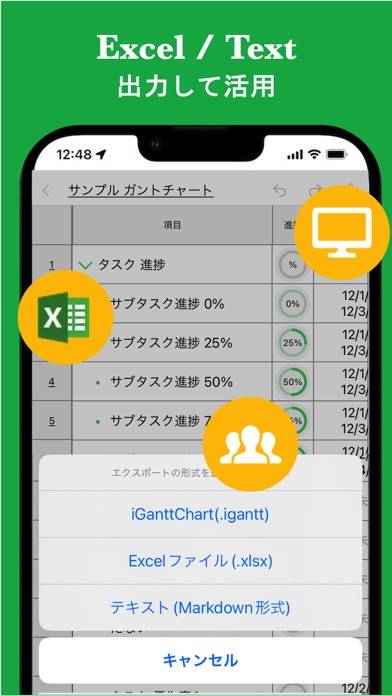 本アプリで作成したガントチャートは、ファイル形式を指定して出力できます。そのためPCでもプロジェクトの管理が可能。もちろんPCで編集したあとは、そのファイルを本アプリで読み込み再度編集できます。