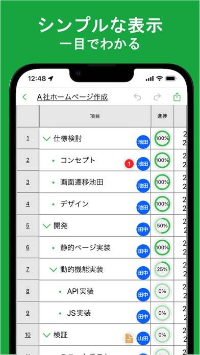 タスク項目と進捗、担当者などがアプリを開けばすぐにわかります。各タスクが一覧で表示されるため、プロジェクトの進捗管理にピッタリ。右側にスクロールすれば、日程を表示してくれるので進捗率と合わせてチェックできます。