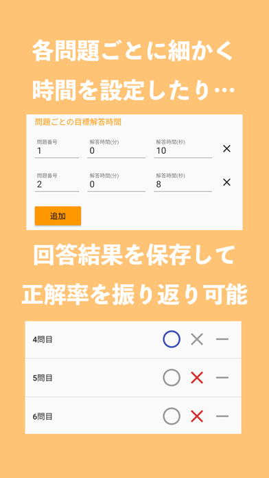 - 各問題ごとの解答時間をタイマーで計測。正答率の振り返りもできる