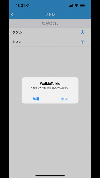 名前を入れるだけで使い始められるトランシーバーアプリです。アプリをダウンロードして開いたら、機能の使用許可を行い名前を入れたら準備完了。あとは通話相手が表示されるので、+ボタンをタップするだけです。