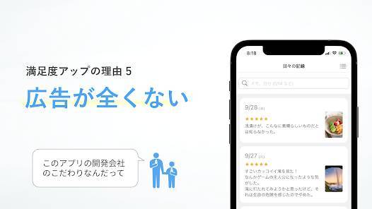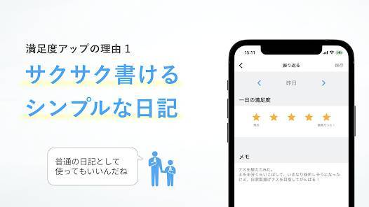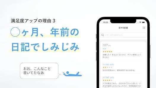 本アプリはメモ欄にその日のできごとや気持ちを書き込みます。手短にさらっと書いておくだけでもOK。1日を振り返って満足度を星の数で表現したり、撮影した写真があれば日記と一緒に保管できたりもします。
