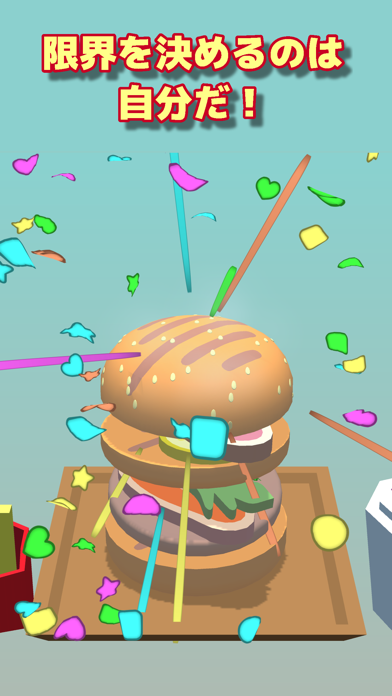 形や大きさが異なる具材を積み重ねていくシンプルなゲーム。30秒以内に具材を置く位置を調整して、落ちないように重ねていきます。「これ以上は無理」と限界を感じた場合、バンズをのせれば記録となります。最大4人までプレイできるため、友達と楽しんでみてください。