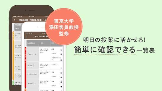 日々の投薬に活かせる9つの一覧表が入っています。本アプリを活用すれば、ステロイド剤の強さや睡眠薬ごとの効果持続時間を簡単に比較可能。使いやすさはもちろん、東京大学大学院の澤田客員教授監修のアプリで、信頼性も十分です。