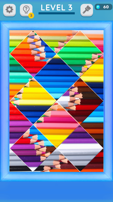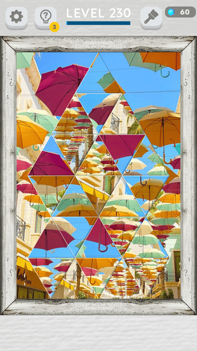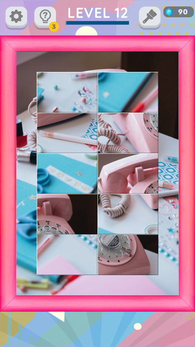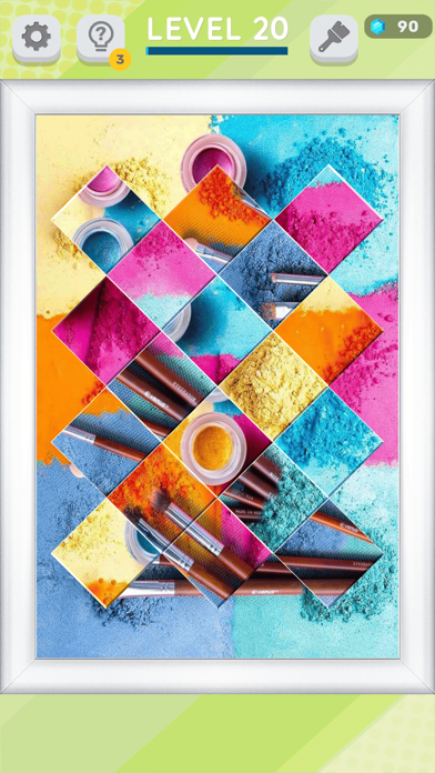 パズルをクリアするともらえるジェムで、パズルの額縁などを増やせます。額縁以外にも、背景や入替時の軌跡、成功エフェクトなどゲーム画面を彩るアイテムがズラリ。何が手に入るかはジャンルごとにランダムですが、パズルで遊ぶモチベーションになります。