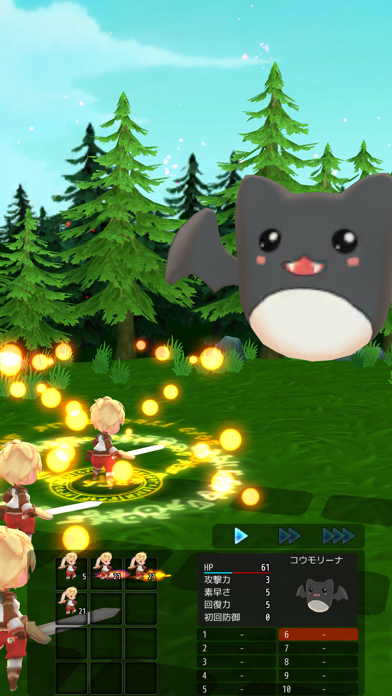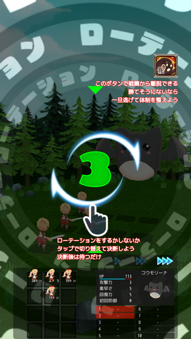 ローテーションとは、隊列を回転させるバトル中の行動です。隊列は、攻撃する前衛、前衛を強化する中衛、HPを自動回復する後衛の3つ。全員の行動が終わると、ローテーションの選択をする時間があります。前衛のHPが減ったら選択するなど判断力が重要です。