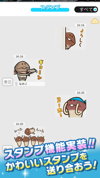 みんなで栽培のグループ内では、なめこスタンプでやりとりが可能。スタンプはかわいいものばかりで、見ているだけで癒されます。スタンプの入手方法は、みんなで栽培のイベント報酬やランキング報酬など。かわいいスタンプをみんなに自慢しましょう。